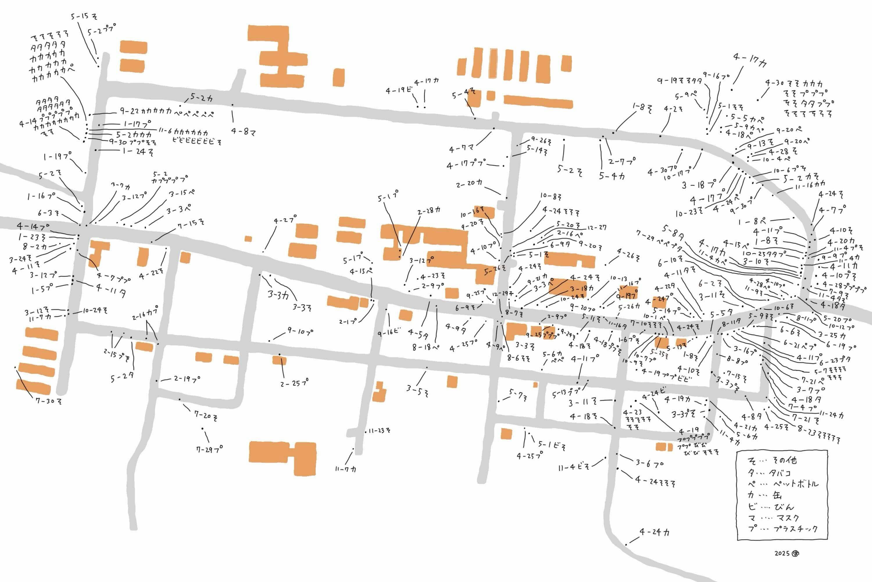 2025年に集落で拾ったゴミの落ちてた場所と種類の記録。